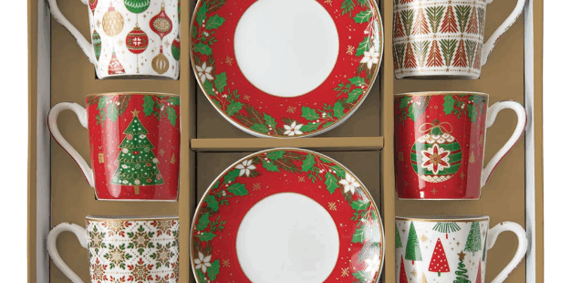 Ce coffret "Jingle Bells" affiche des motifs de Noël festifs et colorés. Parfait pour le café, il allie praticité et charme festif.
