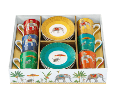 Coffret 6 tasses à café Marajah : porcelaine décorée de motifs orientaux, résistante et compatible lave-vaisselle. Idéal pour vos pauses café ou comme cadeau.