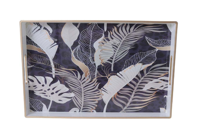 Invitez l’évasion dans votre intérieur avec ce plateau rectangulaire au motif forêt tropicale bleu et blanc.
