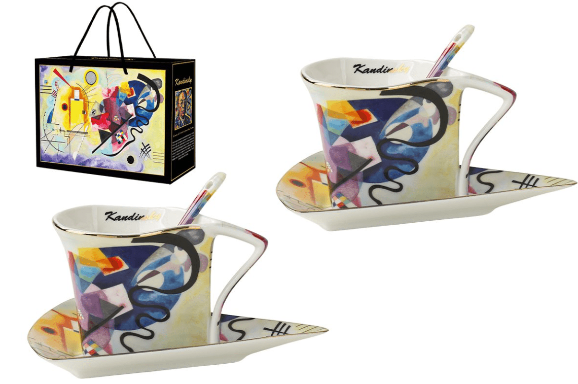 Un coffret artistique et vibrant inspiré de Kandinsky, composé de 2 tasses triangle 180 ml, leurs sous-tasses assorties et cuillères coordonnées.