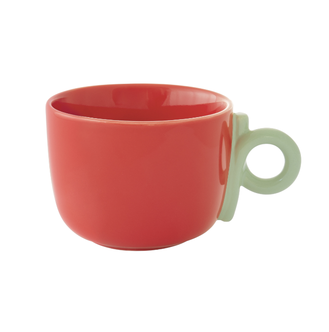 Apportez une touche colorée, ludique et dynamique à votre table avec cette tasse déjeuner rouge en  porcelaine « Creative » et sa anse verte géométrique et décalée. Une tasse idéale pour épater vos invités pendant une pause thé/café.