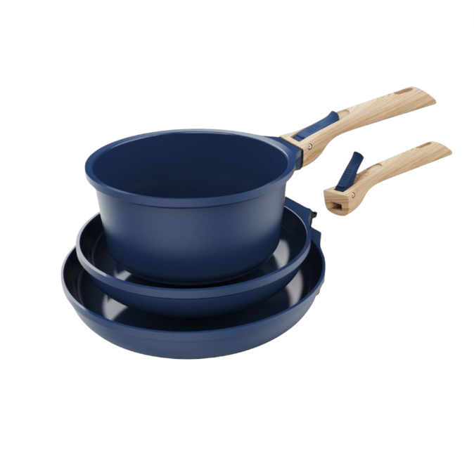 La batterie de cuisine amovible – Myrtille contient une casserole 20 cm, une poêle 24 cm, une poêle 28 cm, 2 poignées amovibles et 2 feutrines de protection.