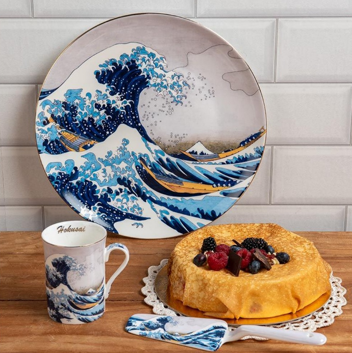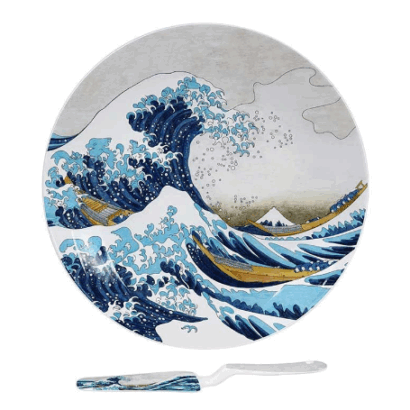 Inspiré de l’iconique estampe La Grande Vague de Kanagawa de K. Hokusai, ce plat à tarte avec pelle allie puissance et élégance. Les lignes fluides et les formes ondulantes capturent le mouvement et l’énergie de la mer, offrant une composition visuelle à la fois saisissante et poétique.