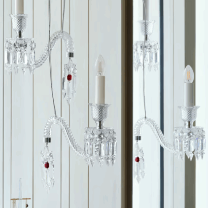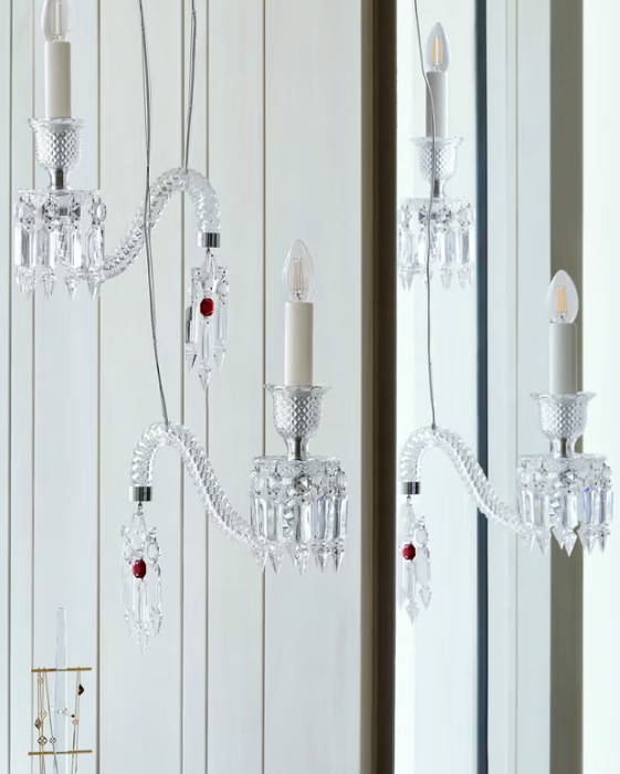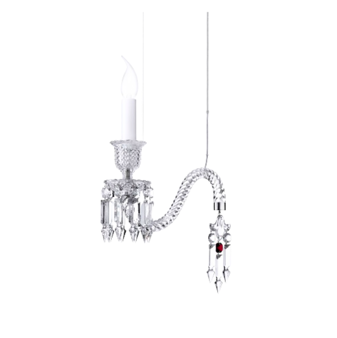 • Design : inspiré du bras du lustre Zénith, avec une structure en cristal clair et un pendentif en cristal taillé, incluant le célèbre cristal rouge Baccarat.