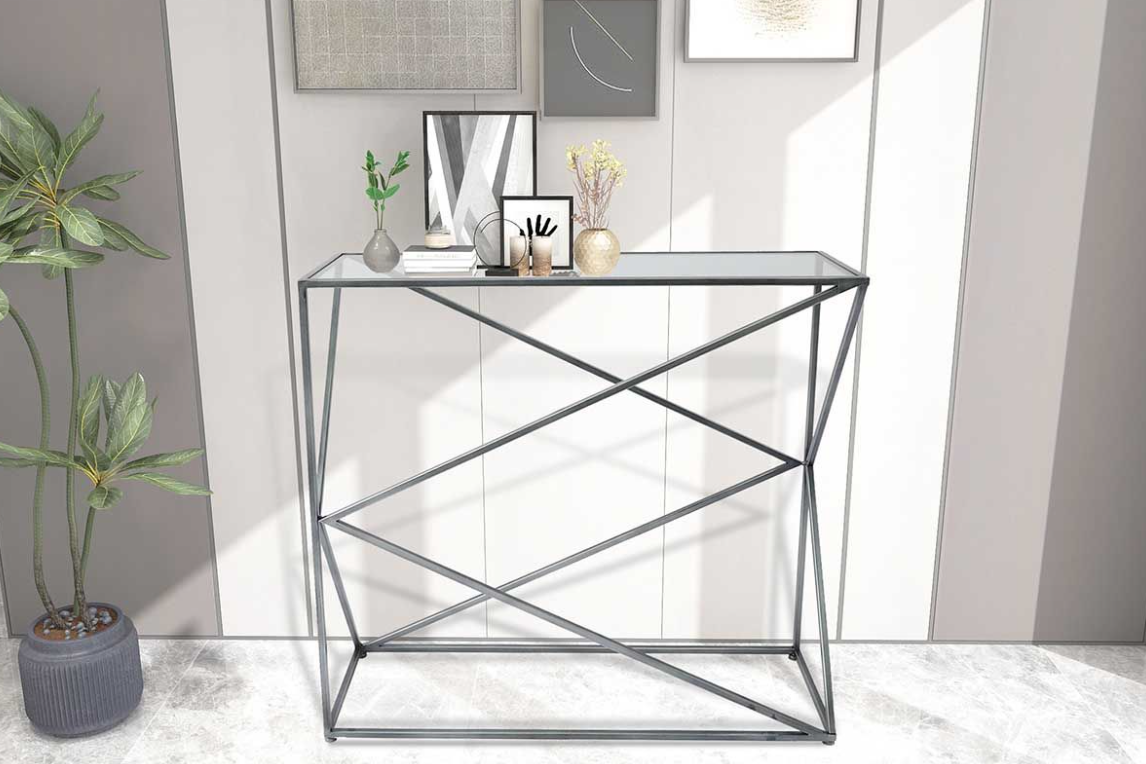 La console grise séduit par son design épuré et sa structure en croisillon, qui apporte légèreté et modernité à votre intérieur.