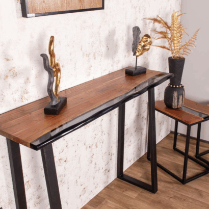 La collection RIVER met en lumière l’artisanat exceptionnel du bois d’acacia associé à la résine époxy. La console noire illustre parfaitement l’harmonie entre nature et modernité.