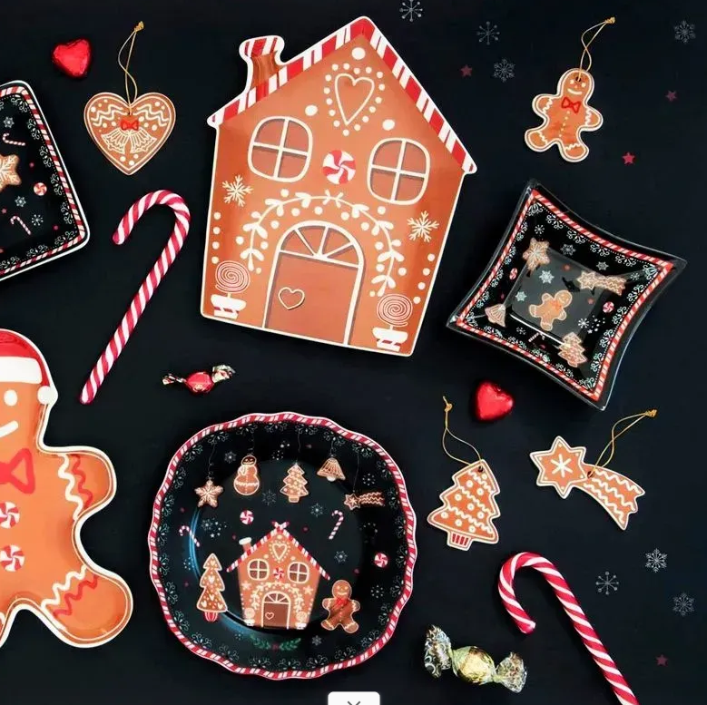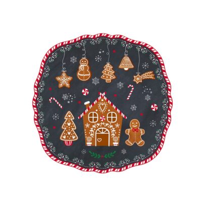 Assiette « Gingerbread » en porcelaine sous le thème de Noël. Assiette aux motifs de « pain d’épice » colorés, ludiques et gourmands, idéal pour partager un repas festif à Noël.